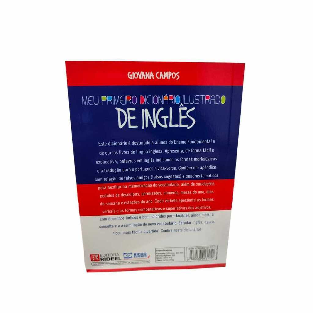 O Meu Primeiro Dicionário Ilustrado de Inglês é destinado aos alunos dos primeiros anos do ensino fundamental e também para cursos de língua inglesa. o Meu Primeiro Dicionário Ilustrado de Inglês apresenta de forma clara mais de 1.600 palavras em inglês, com suas formas morfológicas, tradução para o português, além de aplicação em frases e riquíssima ilustração. Além disso, traz um apêndice com falsos cognatos e diversas expressões. Meses do ano, dias da semana e estações climáticas também estão presentes.
